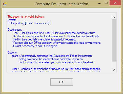 It was important to scroll this dialog up to see “The option is not valid: balkum.” It took me a while of fruitless web searches before the issue dawned on me. When I built this computer, I entered “Stephen Balkum” for a user during the Windows installation. The Azure SDK must have queried the system for my username and called DFInit with this command line:
